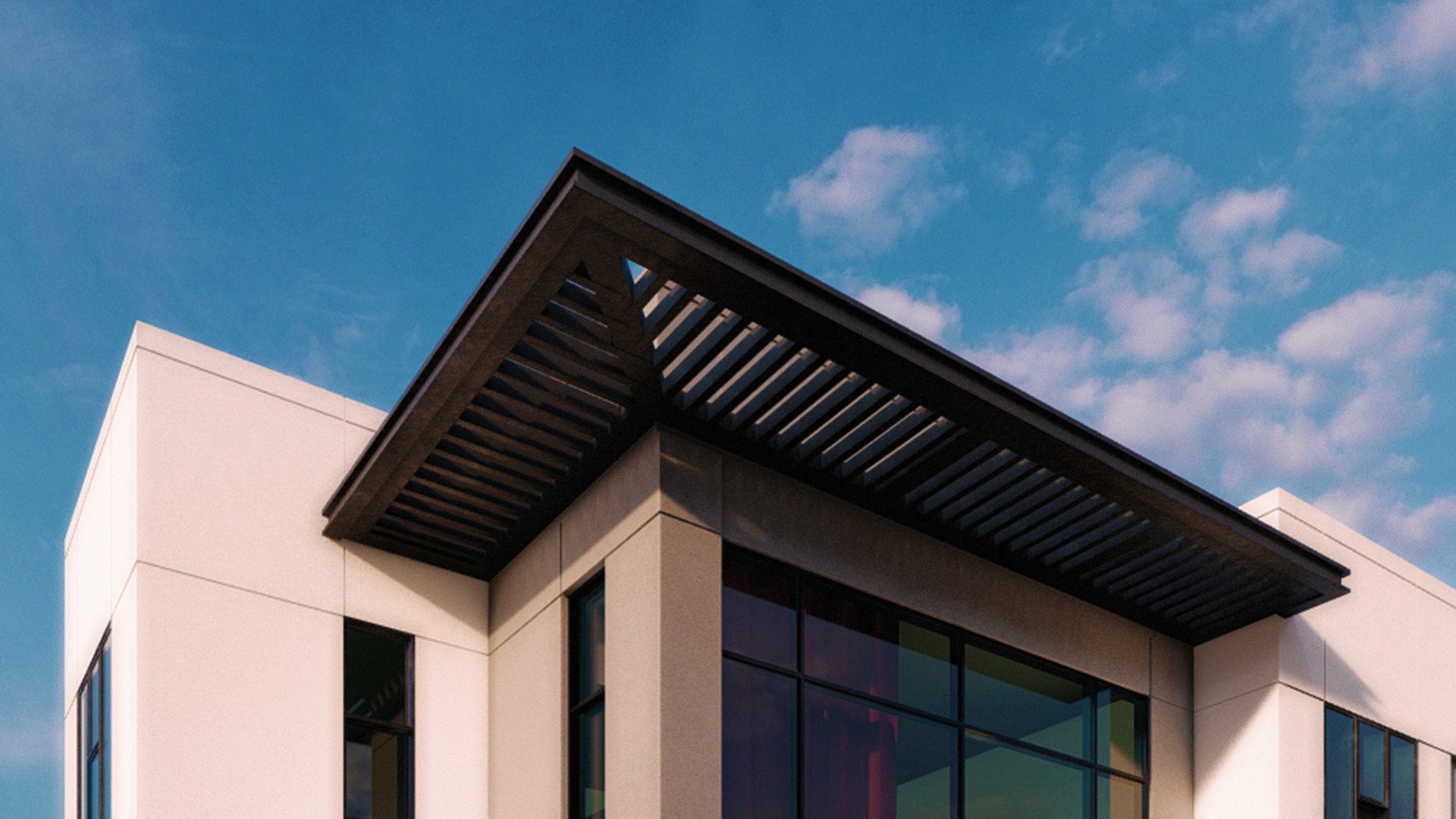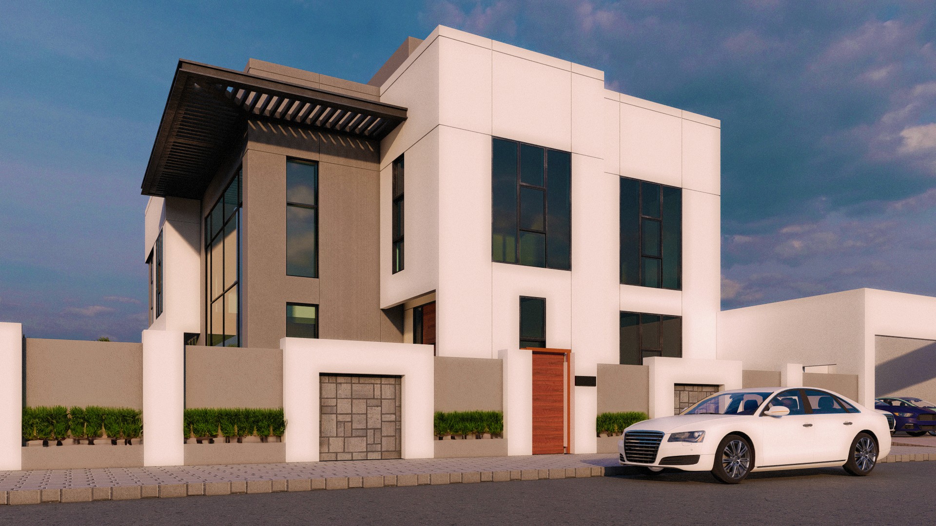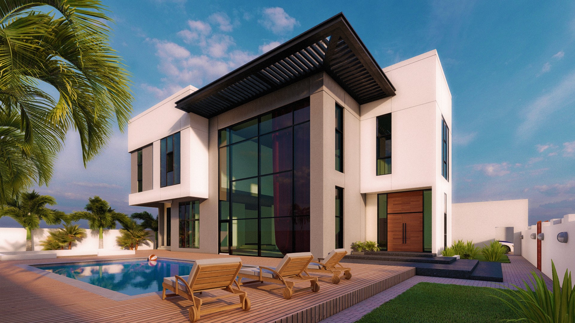 A modern two-storey villa designed around a bright pool courtyard. The front of the house opens up with tall glass panels shaded by a sleek pergola, while the sides stay private with smaller windows. The mix of white walls, warm wood, and dark metal gives the house a clean, elegant look.