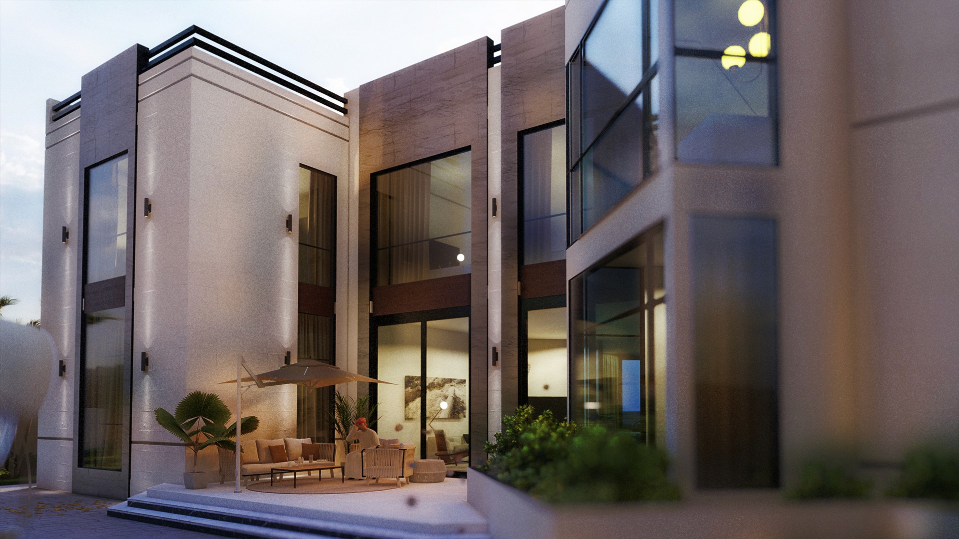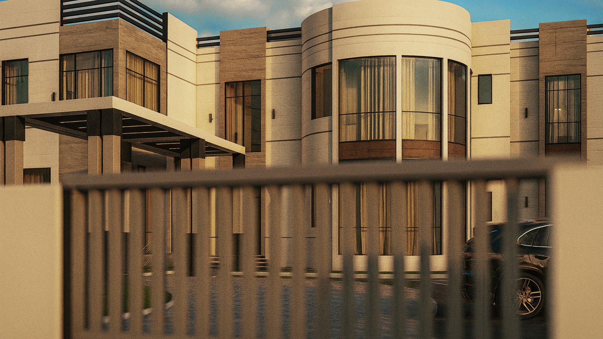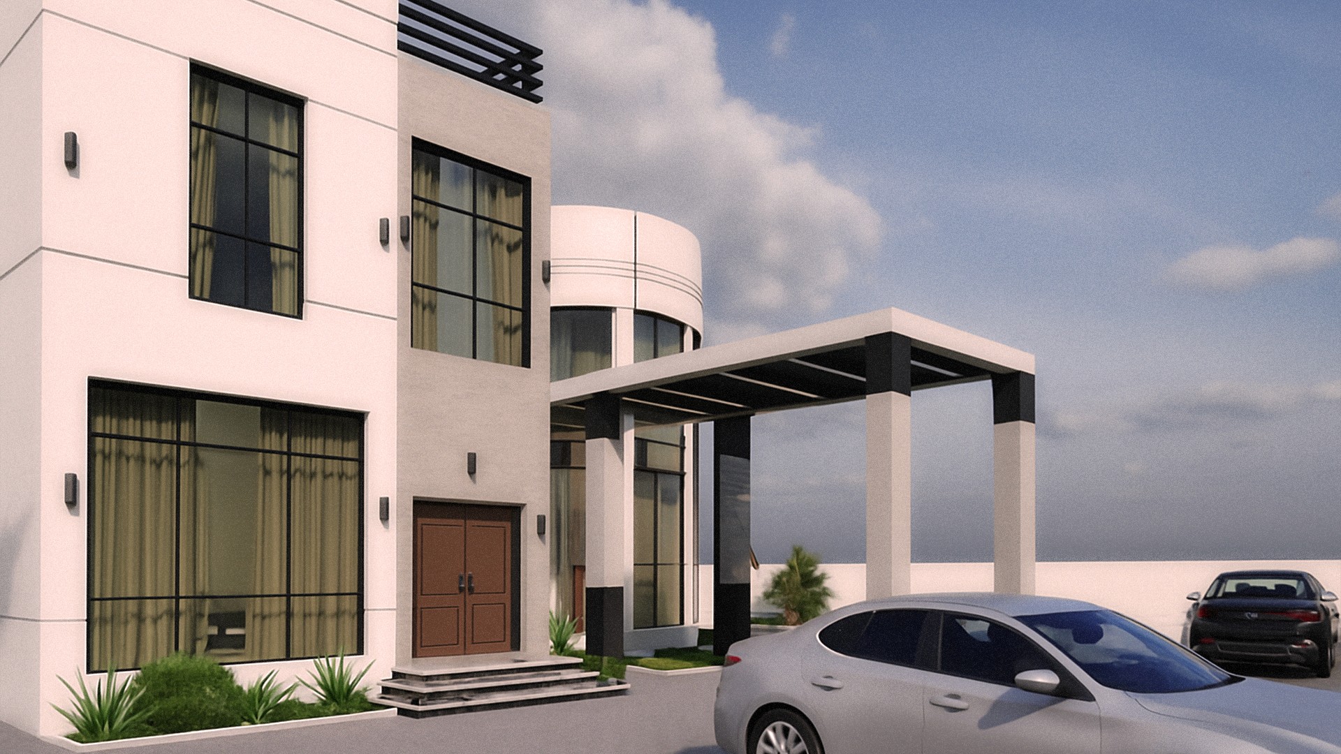 This is a a contemporary, two-story luxury villa. The design features a blend of white and dark gray stone facades, highlighted by a prominent, two-story curved glass center section that floods the interior with light and showcases the elegant spiral staircase. Large windows and clean lines define the modern aesthetic, creating a striking and calm exterior view