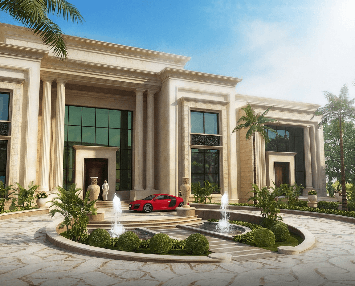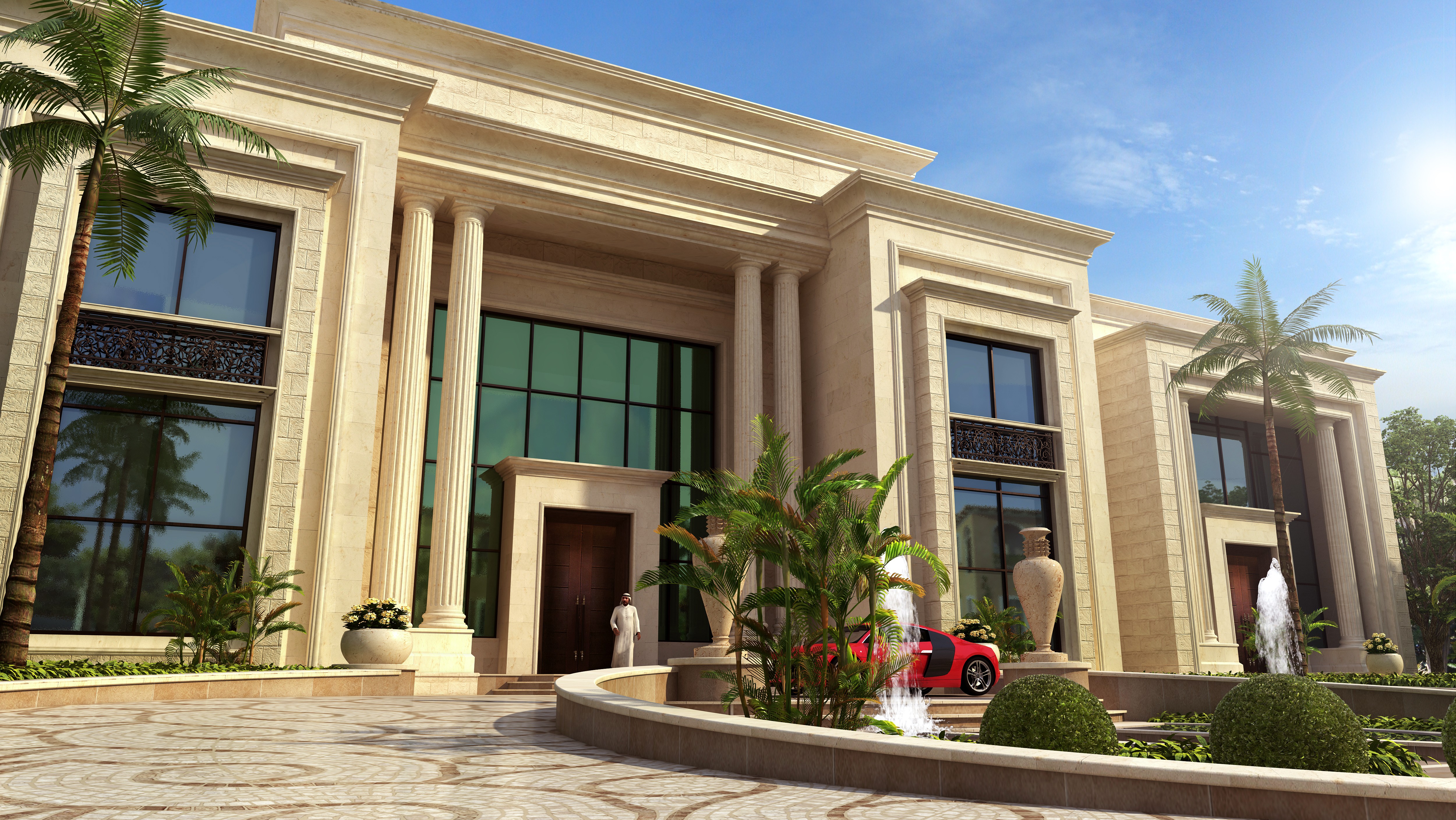 A formal, palace-style villa with a tall central portico, deep cornices, and stone colonnades. Large, shaded glazing faces the arrival court; service wings balance the mass. The elevation reads clear and symmetrical, with durable stone, bronze accents, and a protected main entry.